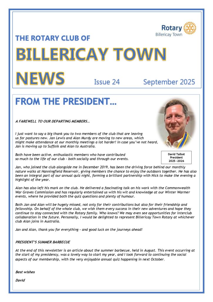 I have lived and grown up in Billericay my whole life and am delighted to lead a club, based in the town, which contributes so much towards it. I have been member of Rotary Billericay Town since December 2019 and am proud to be able to add to its relatively short history as the president for 2025/26.